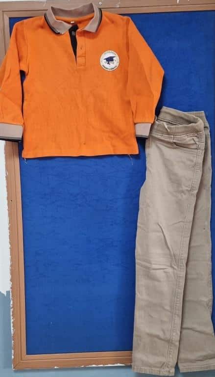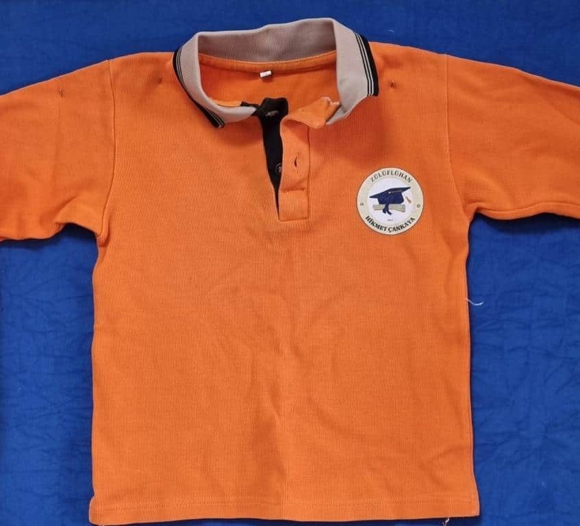 2024-2025 Eğitim-Öğretim Yılı Okul Formamız. Pamuklu kumaş turuncu t-sort üzerinde okulumuz arması sol göğüs üstüne gelecek şekilde kolları açık kahverengi yakalı.